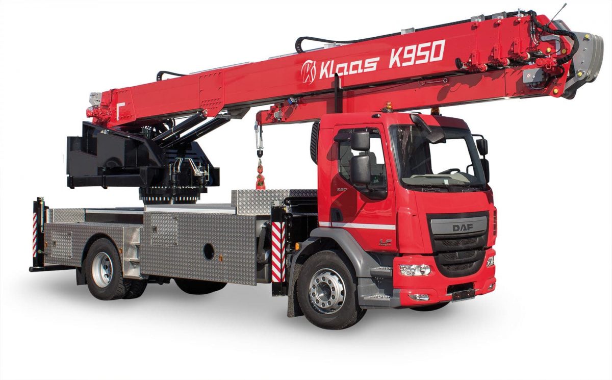 Model dźwigu na samochodzie ciężarowym Klaas K950 to bardzo popularny wybór klientów, ze względu na swoje ponadprzeciętne parametry pracy w połączeniu z kompaktowym rozmiarem. Przykładowo w funkcji rozładowczej może on z łatwością udźwignąć ciężar 5000 kg na wysokość 8,5 m w odległości 6,5 m od wieńca obrotowego masztu. Zalety tego modelu są widoczne w szczególności w trakcie prac w sytuacji ograniczenia przestrzennego, czyli na wąskich ulicach lub ciasnych budowach gdzie krótki rozstaw osi samochodu pozwala zachować dużą skrętność zestawu, a w pełni hydraulicznie podwójnie teleskopowany wierzchołek pozwala operatorowi z łatwością dosięgnąć odległe końce miejsca pracy. Dodatkowo model ten wyposażony jest w hydraulicznie wysuwaną przeciwwagę, które poprawia osiągi dźwigu oraz stabilizuje pracę masztu przy czym jej obecność nie wpływa na nieograniczoną możliwość obrotu wieńca.