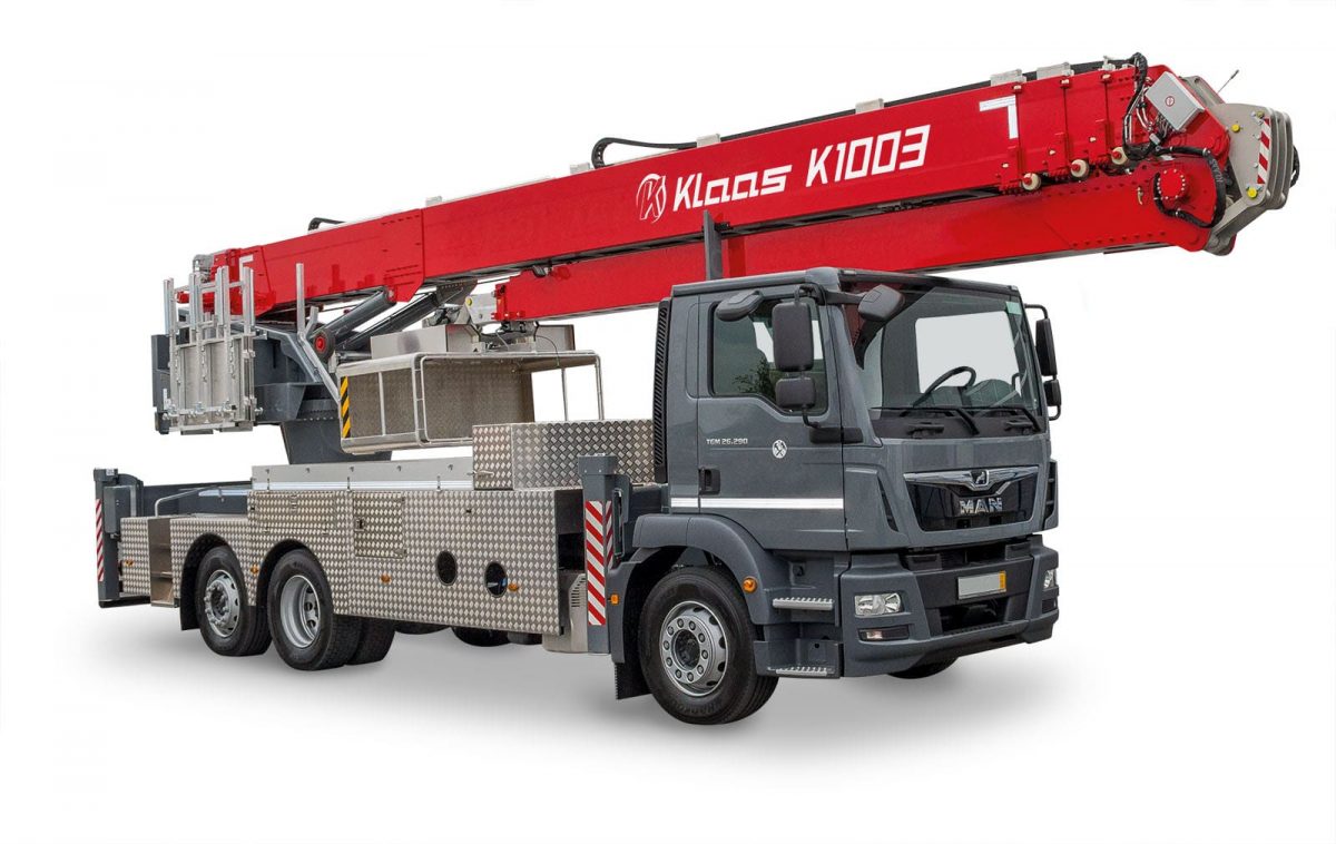 Model dźwigu na samochodzie ciężarowym K1003 to zdecydowanie gracz wagi ciężkiej. Jego imponująca maks. wysokość haka wynosząca 53 m w połączeniu z wysięgiem na odległość 40 m z ładunkiem o ciężarze 350 kg czyni go nieocenionym wsparciem na najbardziej wymagających budowach. Dźwig ten montowany jest jedynie na samochodach ciężarowych trzy osiowych pomimo tego dzięki skrętnej trzeciej osi jego zwrotność i mobilność jest wciąż wysoce satysfakcjonująca. K1003 jest seryjnie wyposażony w pełni hydraulicznie podwójnie teleskopowany wierzchołek, który może się teleskopować i składać symultanicznie.
