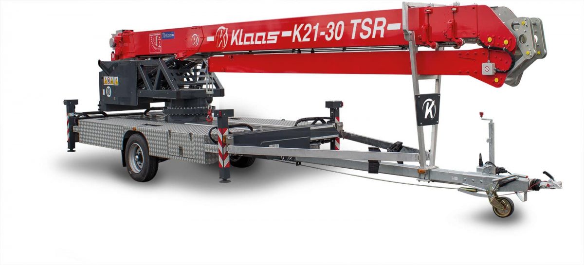 Model dźwigu na przyczepie K21-30 RS to „najmniejsza” z 3,5 tonowych przyczep w aktualnej ofercie produktowej Klaas. Ten wszechstronny model wyróżnia wyjątkowo wytrzymała konstrukcja masztu pozwalająca na podnoszenie ładunków o masie maksymalnej sięgającej do 1 500 kg, czy też wysięgu z ładunkiem 250 kg na imponującą odległość 20 m od wieńca masztu. Dzięki zastosowaniu przez konstruktorów pojedynczej osi zaletą tego modelu stała się jego poprawiona mobilność, dystrybucja masy własnej i wyższy prześwit. Standardowo zaopatrzona w hydrauliczny układ samojezdny przyczepą tą z łatwością może być manewrować na ciasnych placach budów. Chowany dyszel przyczepy skraca całkowitą długość przyczepy z 9,25 m do 7 m tym samym dodatkowo sprzyjając możliwości rozstawienia tego modelu w miejscach gdzie przestrzeń dostępu do budowy jest ograniczona np. podwórzach kamienic miejskich czy zabytków.